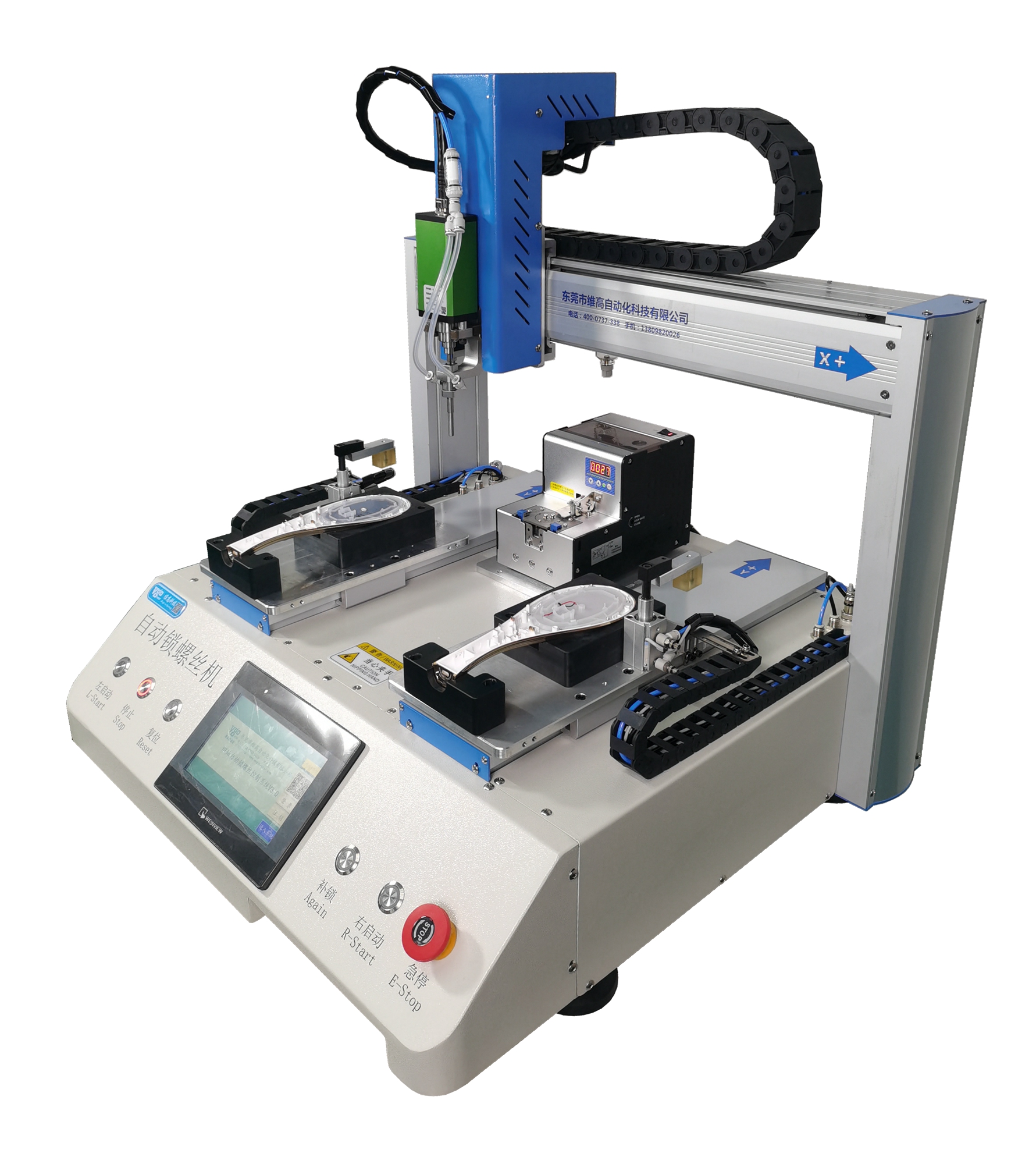 VGLS-TP5331V桌面式單頭雙工位自動鎖螺絲機一、用途適用于各類需要鎖附螺絲的產品。電子類產品如手機、計算器、導航儀、音響、筆記本電腦、鍵盤等;電器類產品如燈座、開關、風扇、電飯煲、冰箱等。二、主要功能整機功能由螺絲供料系統+精密定位系